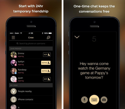 这款应用的开发团队来自美国,它们熟悉当下年轻人的交友方式,“Sobrr”能让这些人无所顾忌的畅所欲言,就算拍下了一些让他们后悔的照片,或说过了一些不合时宜的话也无所谓,适合大胆表达自己的情绪。如果对方是陌生人,你们之间的交流时间仅有24小时,只有在双方互有好感的情况下才能得到联系方式,否则你们只是对方生命中的过客。