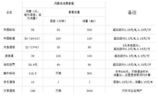 从表格中可以看出,一部分虚拟运营商入门门槛较低,如天音通信、话机世界、京东通信等,月最低消费均在30元以下,这些企业对于消费能力较低的用户来说,确实是不错的选择。